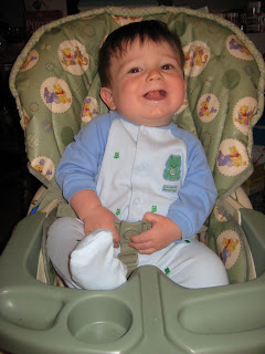 The doctor also said Max can now eat just about anything. We will still avoid the high allergy foods, just to be sure, but with no history of food allergies we don't actually have to avoid those. I'll err on the side of caution. But Max is now cleared for dairy and meat. So last night he had his first YoBaby yogurt. Mixed berries. He was a BIG fan. Maybe it is the baby version of yotastic yogurt. You never know. :) The serving size is actually pretty big, for a baby. And he ate almost all of his little pot of yogurt after eating a full serving of cereal, a cube of rutabaga and a cube of carrot, some grape quarters, and some blackberry quarters. He also tried rice rusks for the first time and demolished them. So that is another excellent food for taking on our trip. And he didn't make a huge mess with them like he did the first time he had an arrowroot cookie. All in all it was a good day for foods.